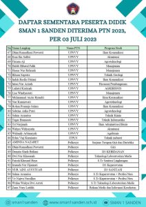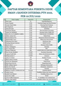 Daftar Peserta Didik SMAN 1 Sanden yang Diterima di Perguruan Tinggi Tahun 2023 Tinggalkan Komentar / Oleh Admin Sekolah / 3 Juli 2023